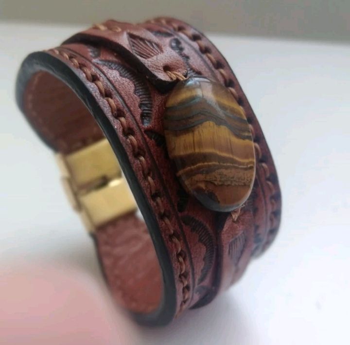 دستبند چرم طبیعی چرم حکاکی شده و سنگ + فروش ویژه