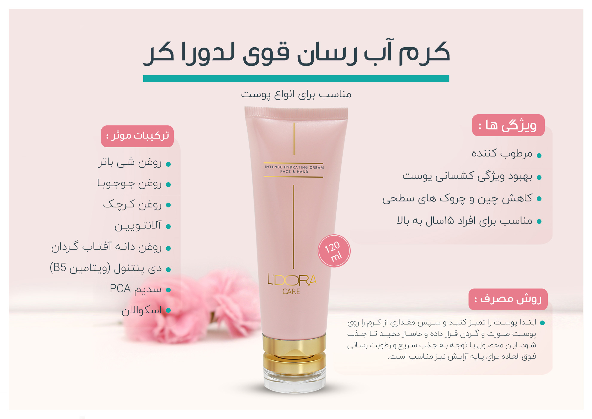 این محصول حرفهای یک مرطوبکننده مناسب برای انواع پوست است مواد موثر منحصر بهفرد موجود در کرم آبرسان قوی لدورا علاوه بر آبرسانی به بهبود ویژگی کشسانی (الاستیسیته) پوست نیز کمک میکند. این کرم فوقالعاده سبک و ملایم است و باعث کاهش چروکهای سطحی پوست میشود.