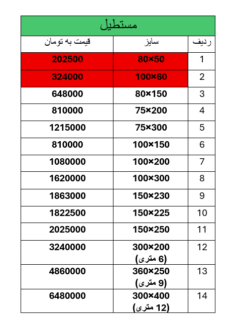 | سایز 400×300 (12 متری) | 6.480.000تومان |