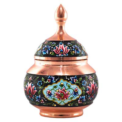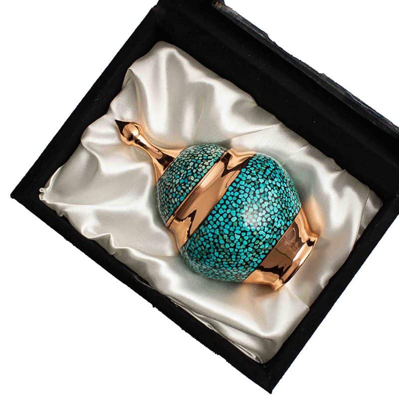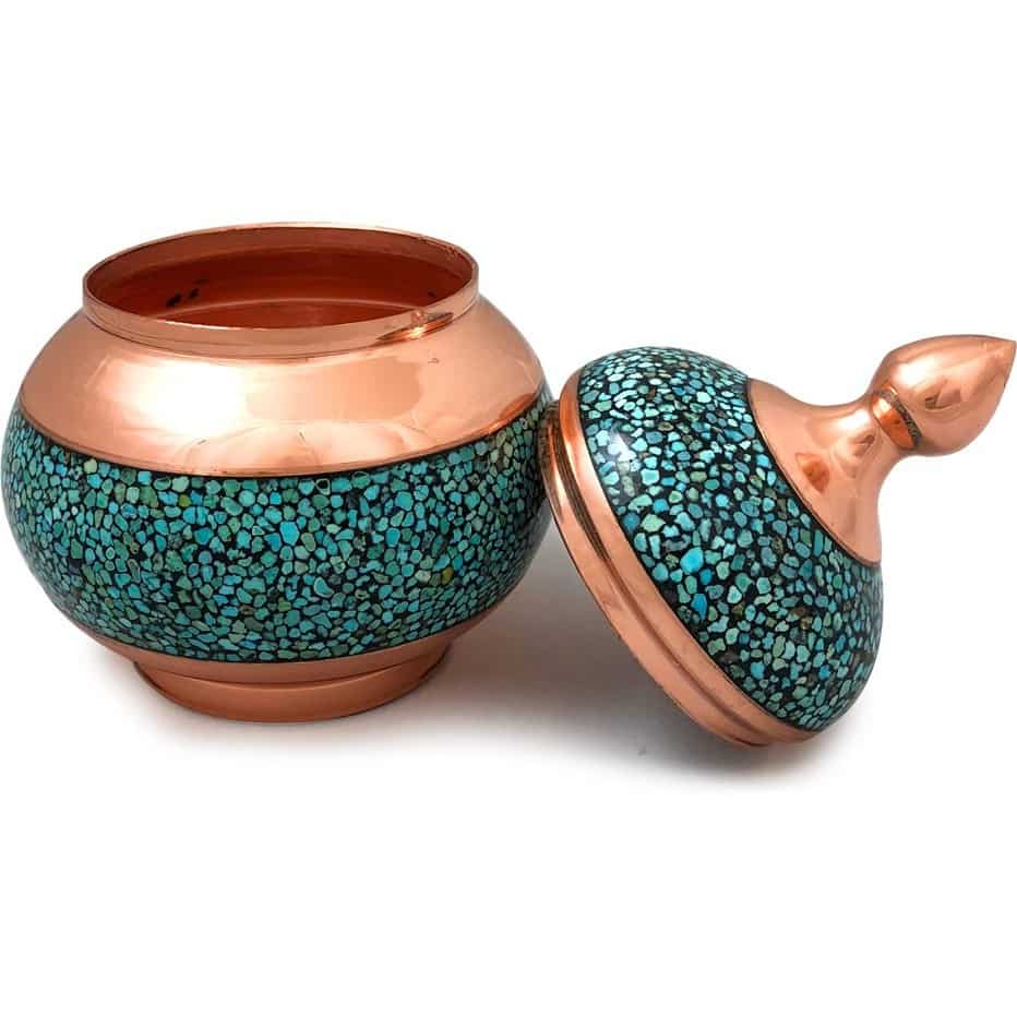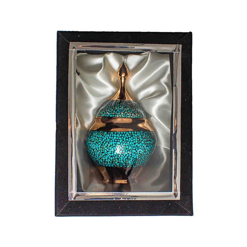 قندان فیروزه کوبی یک اثر هنری زیبا و نفیس است که در آن سنگ های فیروزه به صورت دقیق و منظم بر روی سطح فلزی مانند مس یا برنج قرار می گیرند. این هنر دستی ابتدا شامل برش دادن سنگ های فیروزه به قطعات کوچک و چسباندن آن ها بر روی سطح فلز است. سپس، سطح کار با دقت صاف و صیقل داده می شود تا نمایی براق و جذاب ایجاد شود. قندان های فیروزه کوبی معمولاً برای سرو قند یا شکر در مراسمات خاص استفاده می شوند و به دلیل زیبایی و کیفیت ساخت، به عنوان یکی از آثار محبوب صنایع دستی ایران شناخته می شوند.