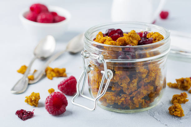 گرانولا جو دوسر میوه ای ترکیبی رنگارنگ از تکه های میوه خشک و دانه های جو دو سر برشته است. طعم طبیعی و بافت متنوع آن برای تمام ذائقه ها جذاب است. این گرانولا منبعی غنی از ویتامین ها و فیبر بوده و در تنظیم سوخت و ساز بدن نقش دارد. مصرف آن همراه ماست یا شیر حس تازگی و نشاط ایجاد می کند. انتخابی سالم برای شروع روزی پرانرژی است.