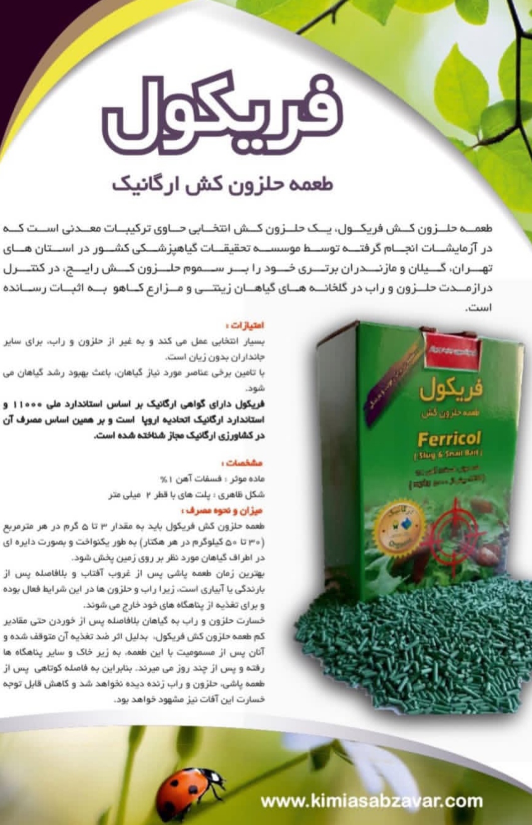 طعمه حلزون کش فريكول، يک حلزون کش انتخابي حاوي تركيبات معدني است که در آزمايشات انجام گرفته توسط موسسه تحقيقات گياهپزشكي كشور در استان هاي تهران، گيلان و مازندران برتري خود را بر سموم حلزون كش رايج، در كنترل درازمدت حلزون و راب در گلخانه هاي گياهان زينتي و مزارع كاهو به اثبات رسانده است.