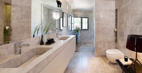 سرامیک سرویس بهداشتی جدید با طراحی های مدرن و متریال های پیشرفته، فضایی لوکس، آرامش بخش و یکپارچه ایجاد می کند. استفاده از سرامیک های اسلب با ابعاد بزرگ و لعاب مات، همراه با طرح های رگه دار ساده، خطوط عمودی یا بافت های موج دار، دیوار ها را زیبا و عمق دار نشان می دهد. رنگ های خنثی مانند طوسی، کرم و سفید با جزئیات طلایی یا نقره ای، جلوه ای شیک به فضا می بخشند و ویژگی های ضد آب و نانو سرامیک ها، نگهداری آسان و مقاومت بالا در برابر رطوبت و لکه را تضمین می کند.