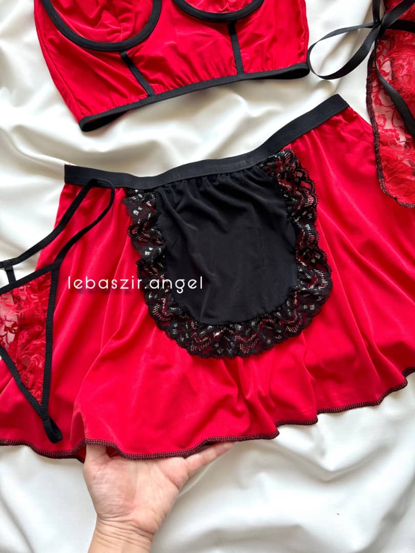 کاستوم فانتزی ۴ تیکه ست کامل: شامل نیمتنه فنردار، شورت لامبادا، دامن و شنل مناسب سایز 38 تا 44 سایز یک مناسب کاپ سینه 75.80 سایز دو مناسب کاپ سینه 80.85