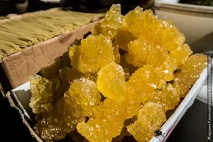 نبات شاخه ای زعفرانی تلفیقی هنرمندانه از شیرینی و عطر گیاه پربهای ایرانی است. رنگ زرد زیبا که از زعفران خالص به دست می آید، جلوه ای درخشان به شاخه های بلورین می دهد. این شیرینی سخت، به آرامی در مایعات گرم حل می شود و رایحه ای دلنشین در فضا پخش می نماید. شاخه های بلند آن استفاده را برای همگان ساده می سازد. طبیعت این خوراکی موجب شده است که مصرف آن برای آرامش ذهن توصیه شود. زعفران به کار رفته، خواص آنتی اکسیدانی مفیدی را به محصول اضافه می نماید. نگه داری این بلورها در محیطی خشک، شفافیت و طعم اولیه آن را حفظ می کند. این نبات نمادی از کیفیت بالا در شیرینی پزی سنتی ایرانی است.