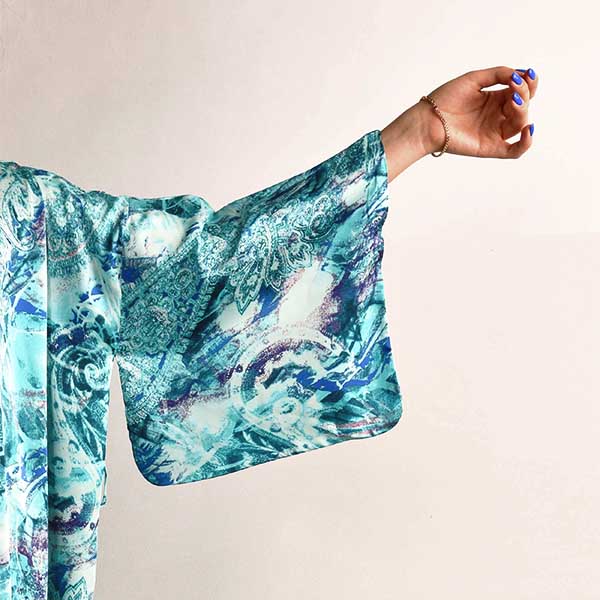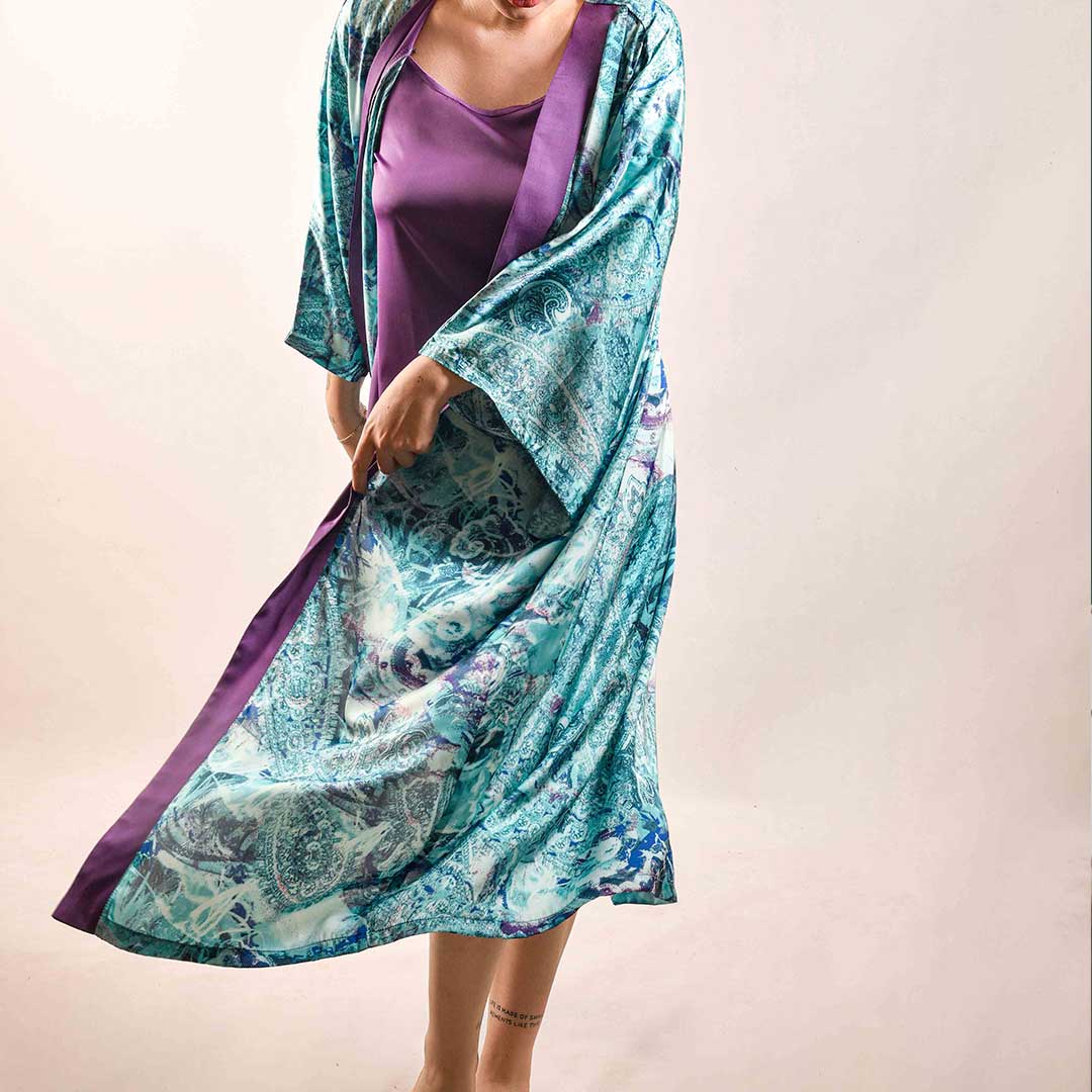 ویژگی ظاهری: رنگ: آبی طرحدار فیروزه ای + بنفش کمربند گره ای ساتن جلو باز جنس : ساتن ابریشم طرح دار قد : 140cm سایز: 36 تا 46 کجا بپوشید؟ کلیپ ،مهمانی ،خانه ، خواب ،بارداری نحوه ی نگه داری و شست و شو: با آب سرد شسته و یا خشکشویی شود حداکثر دما 60 درجه