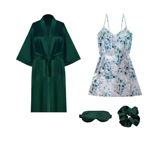 ست روبد و شامبر و پیراهن خواب ساتن ابریشم به همراه چشم بند و کش مو